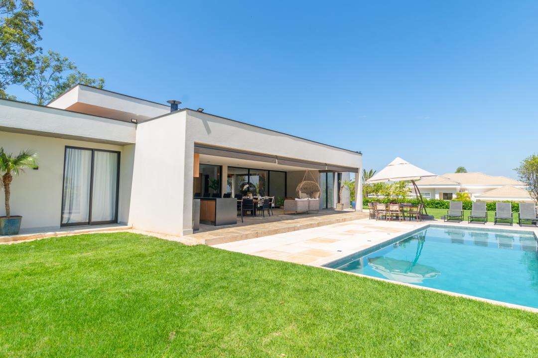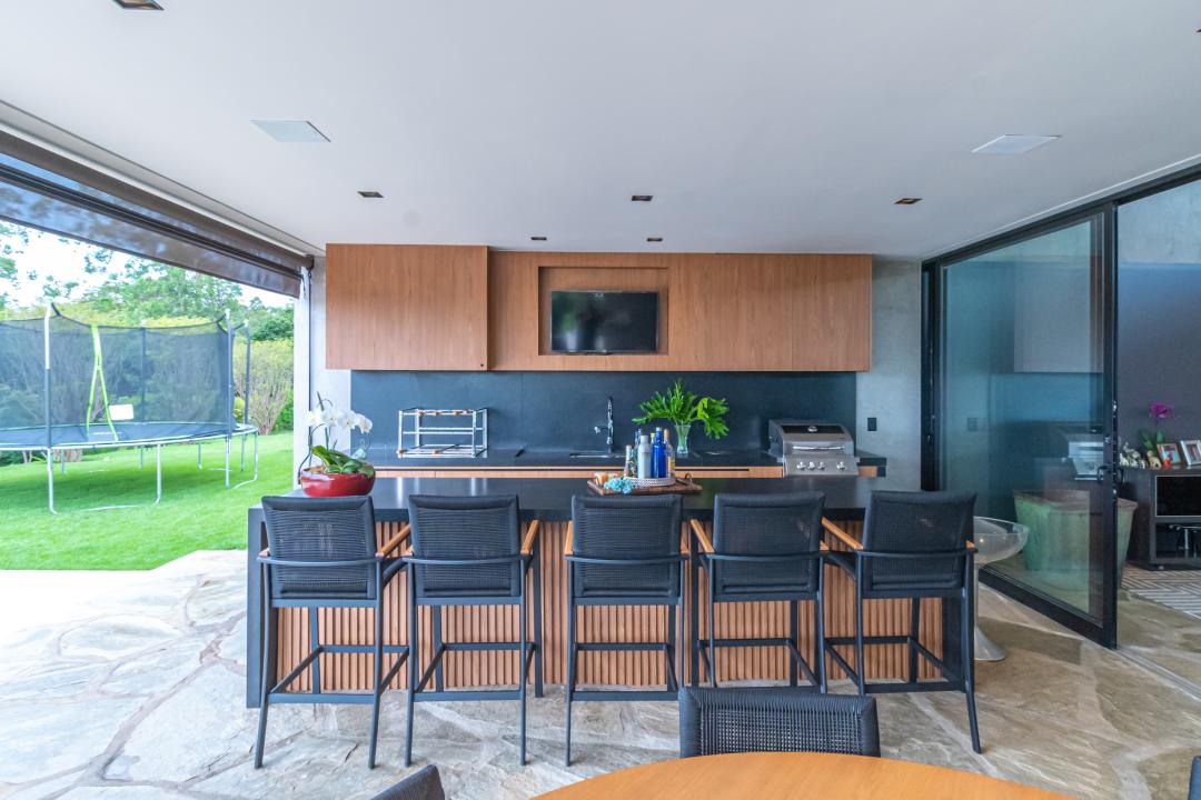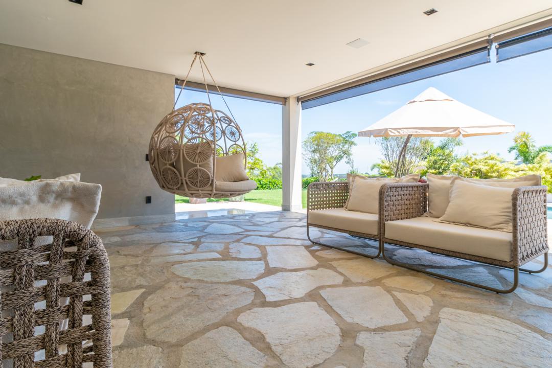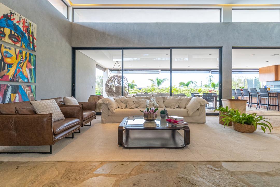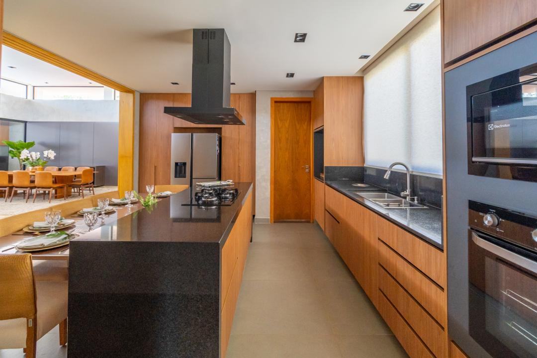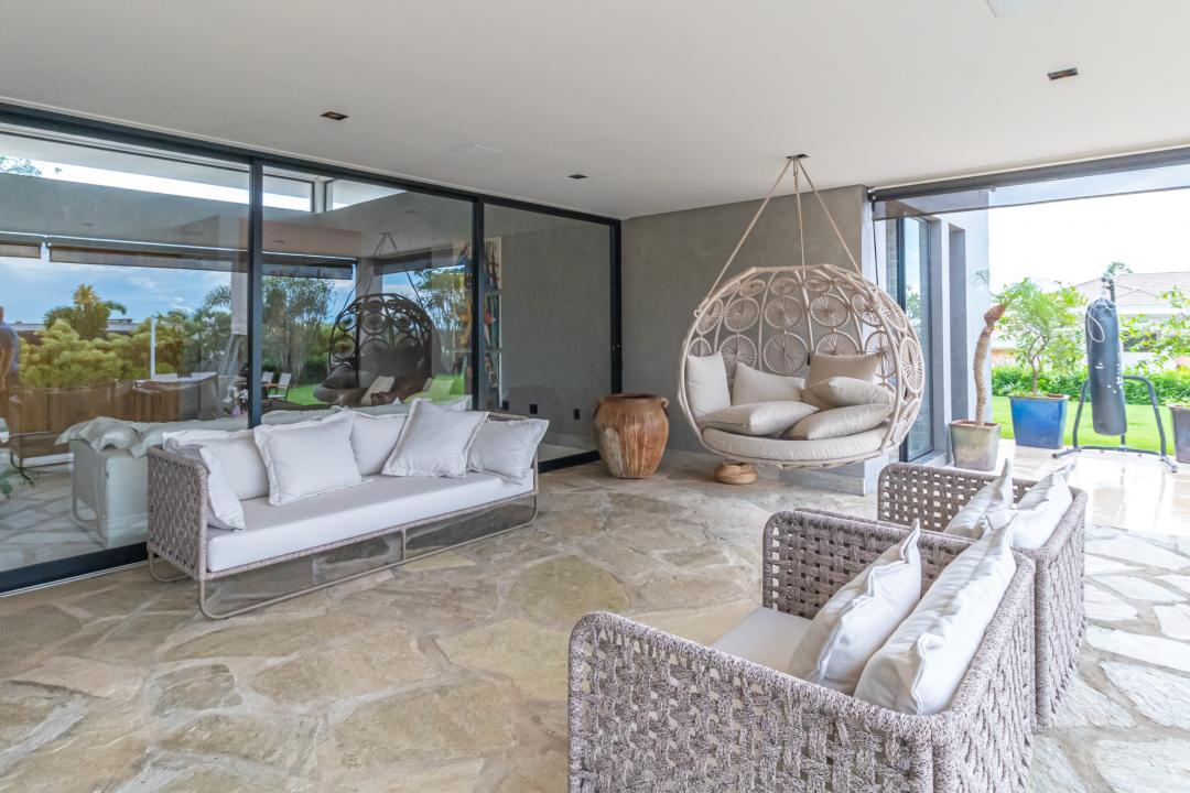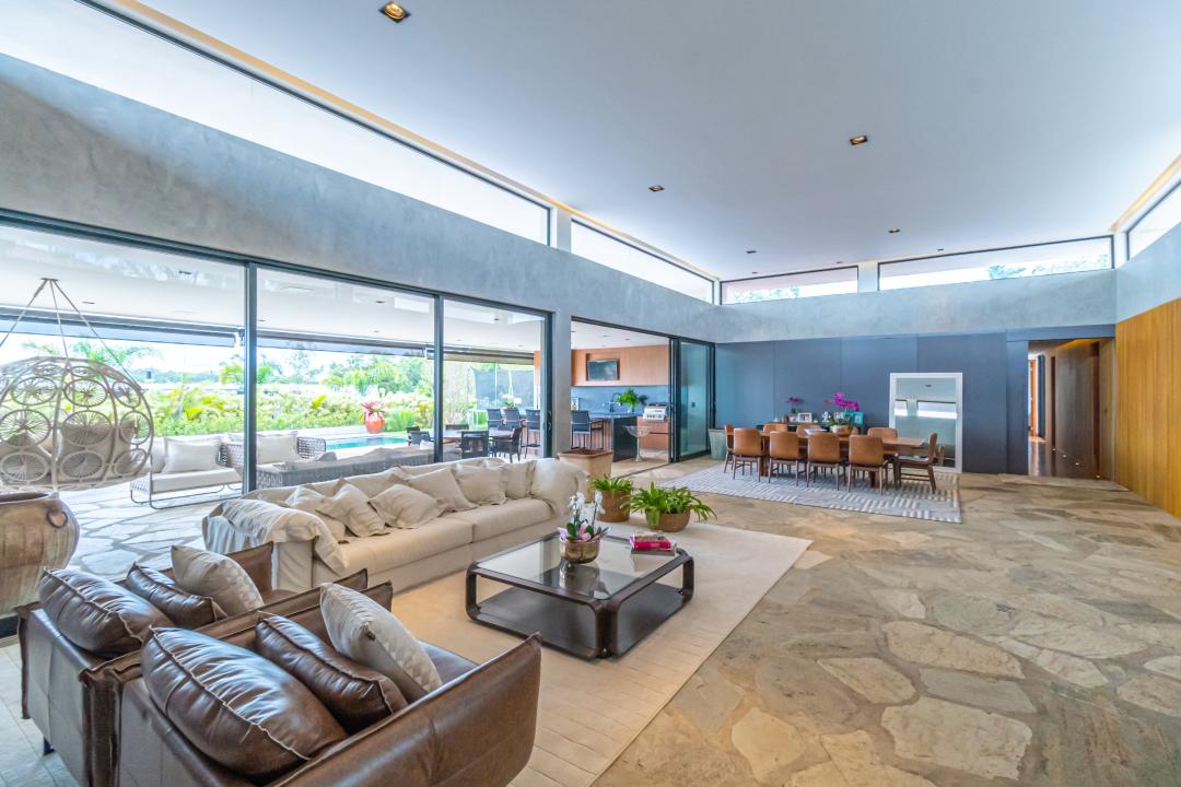 A casa oferece ampla área de convivência integrada dispondo de sala de estar, lavabo, sala de jantar, home theater, cozinha com ilha e espaço gourmet completo.