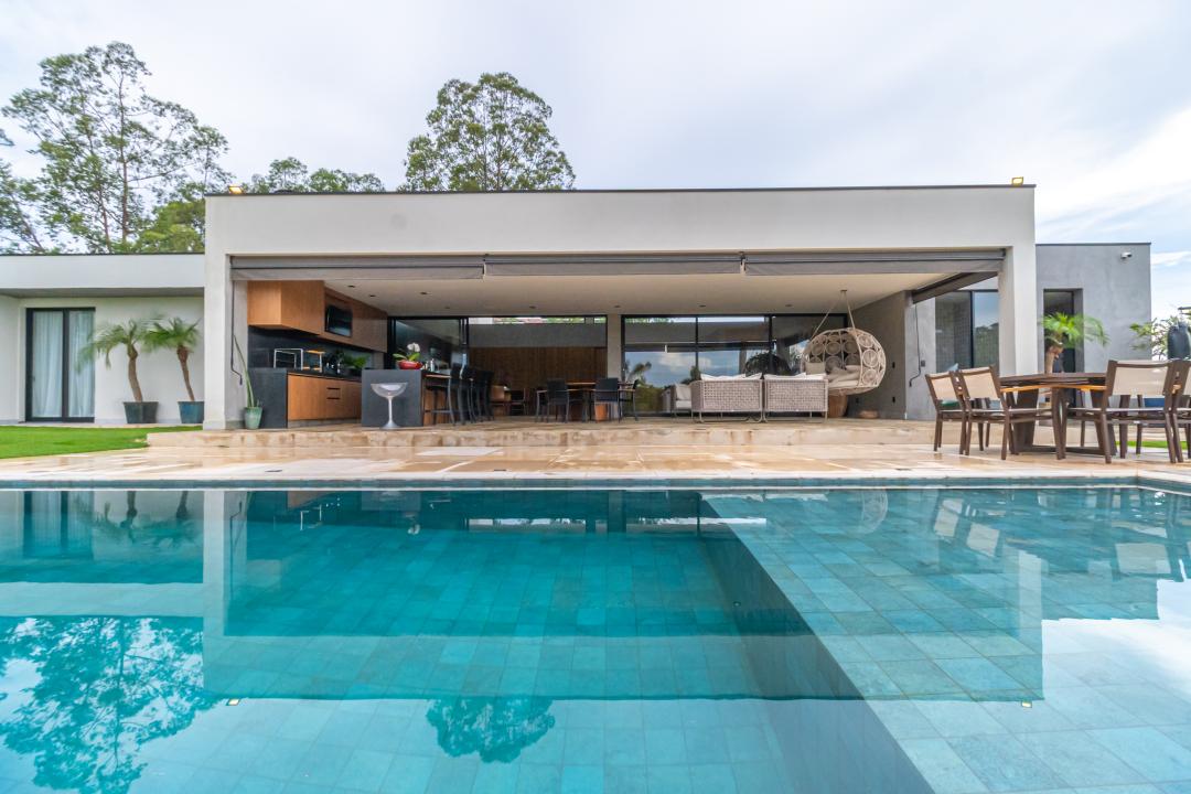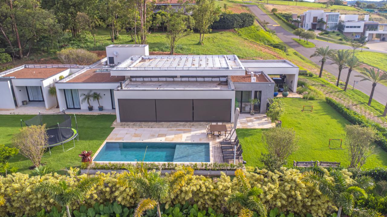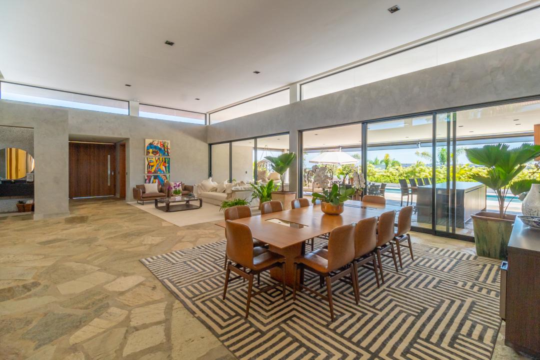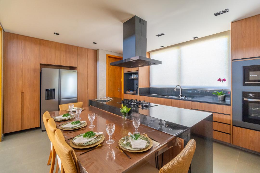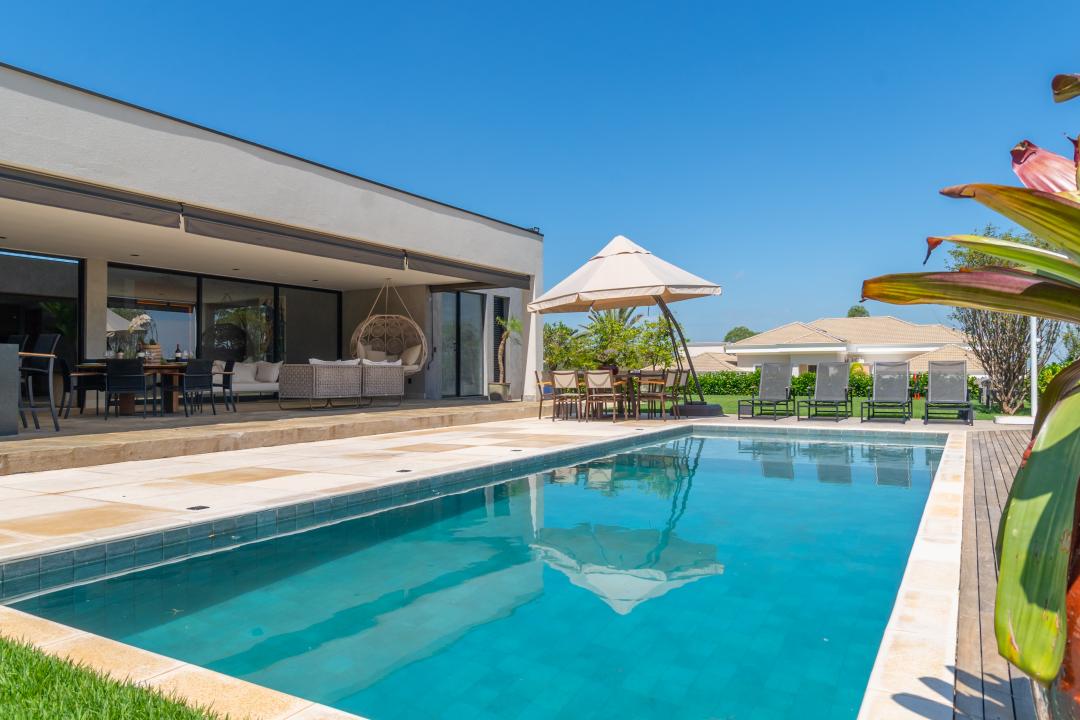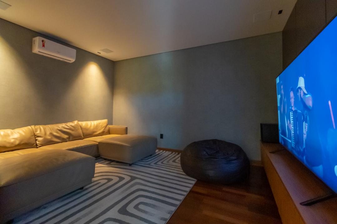 A casa oferece ampla área de convivência integrada dispondo de sala de estar, lavabo, sala de jantar, home theater, cozinha com ilha e espaço gourmet completo.