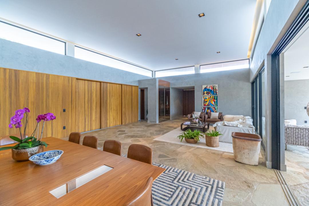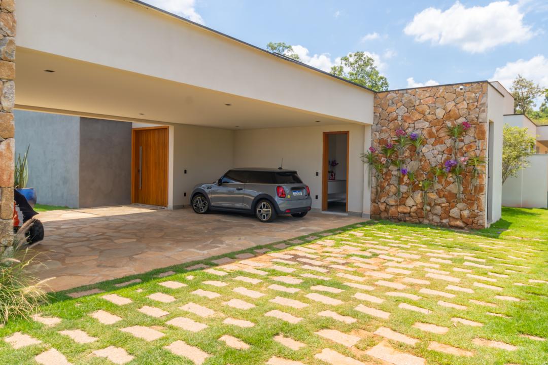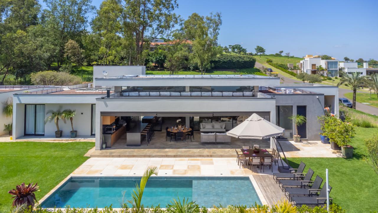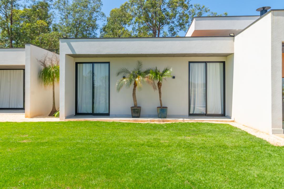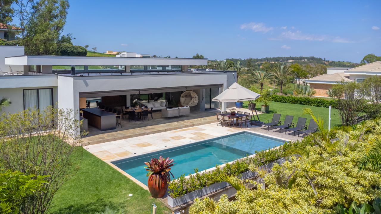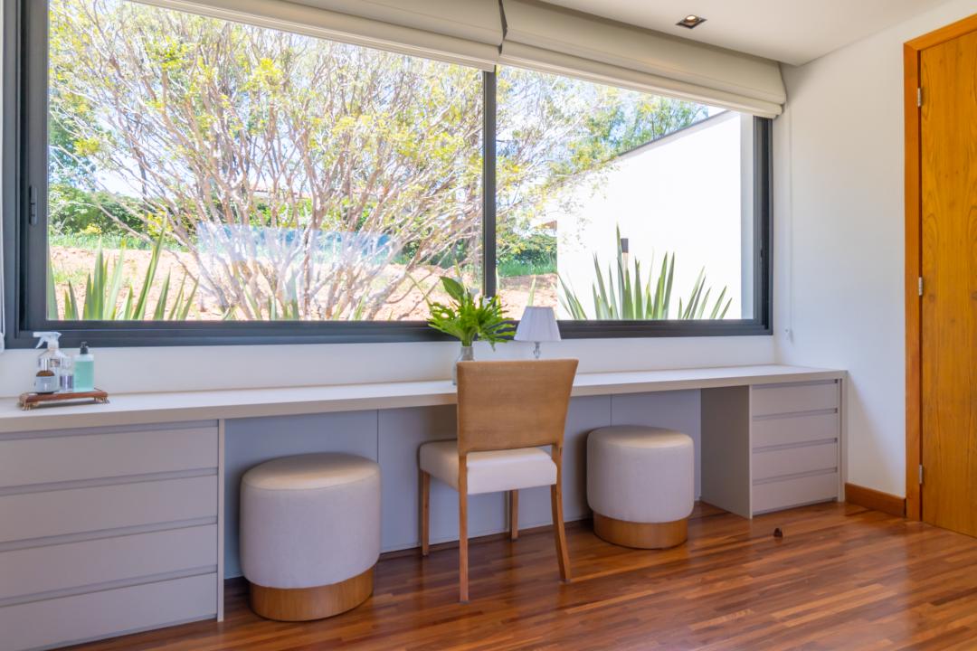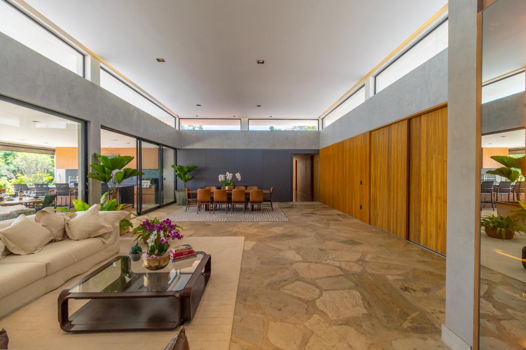 A casa oferece ampla área de convivência integrada dispondo de sala de estar, lavabo, sala de jantar, home theater, cozinha com ilha e espaço gourmet completo.