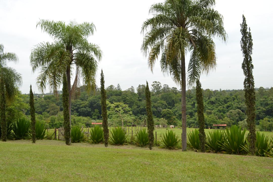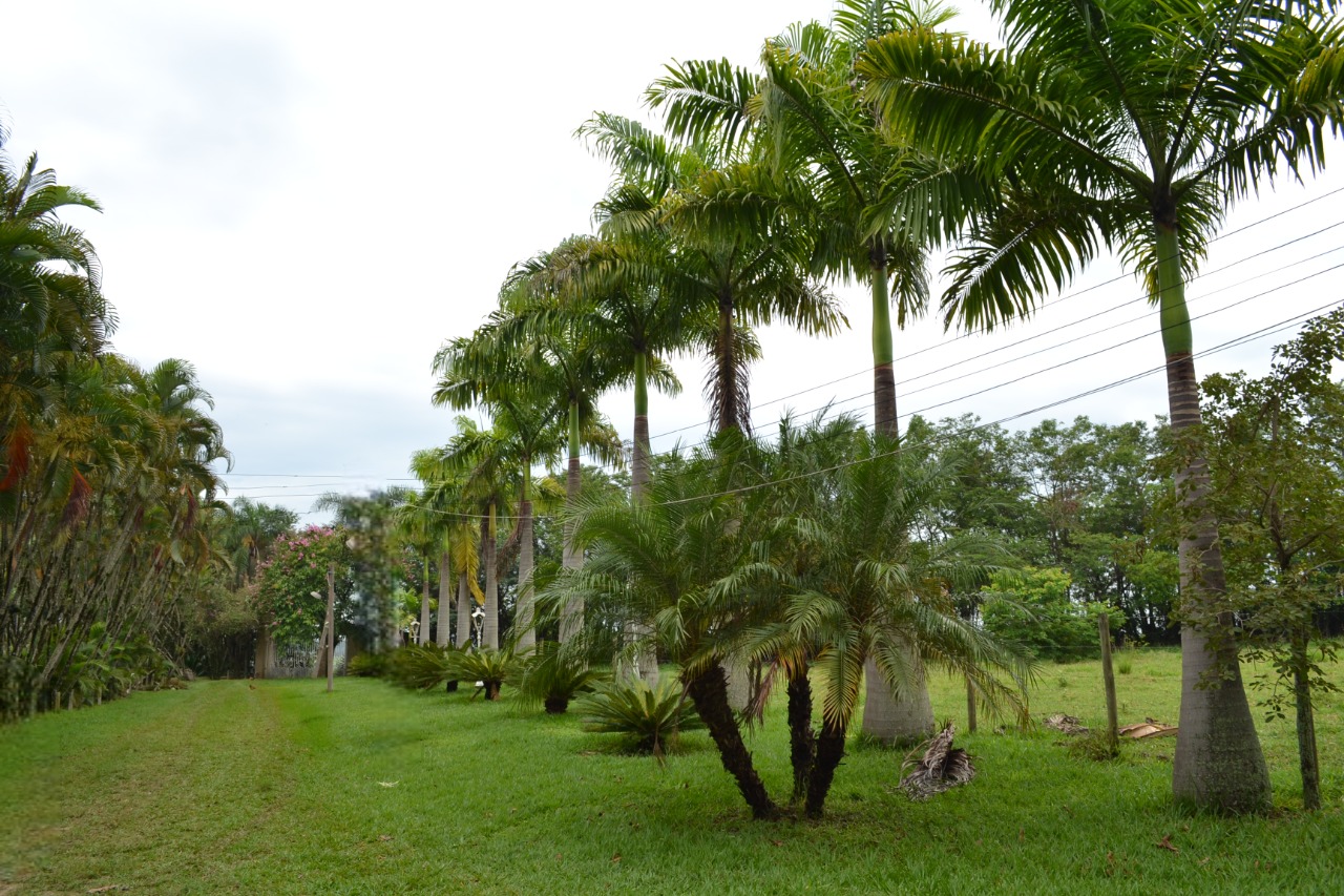 Linda área verde gramada com belíssimo paisagismo, entrada da propriedade com belíssimas palmeiras reais e arecas bambus ladeando um belo gramado