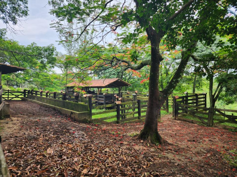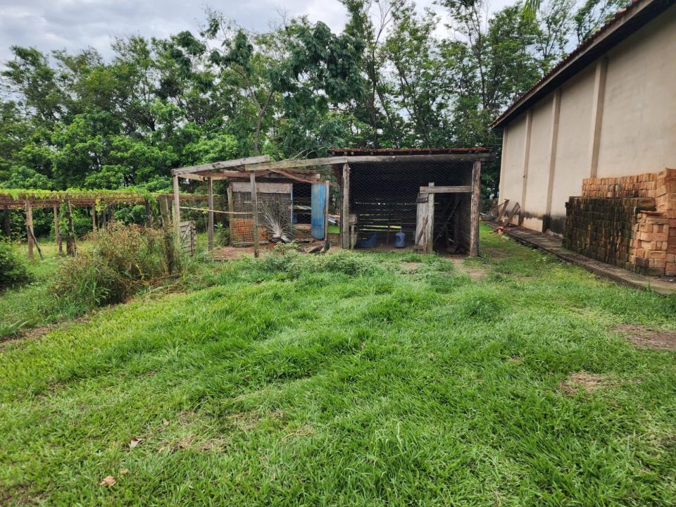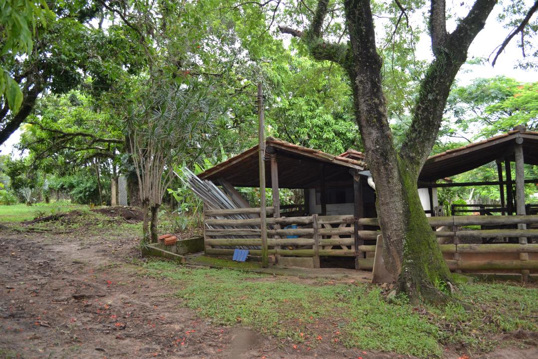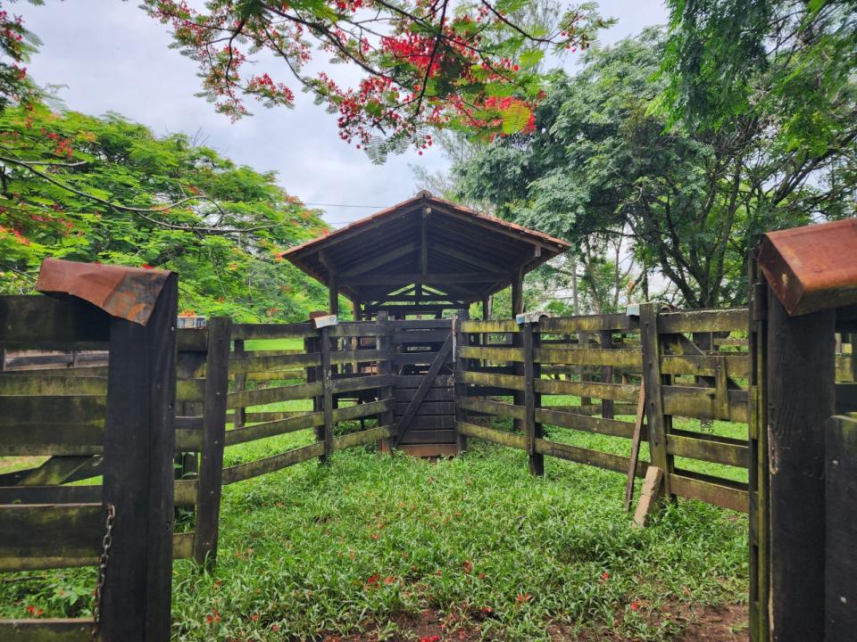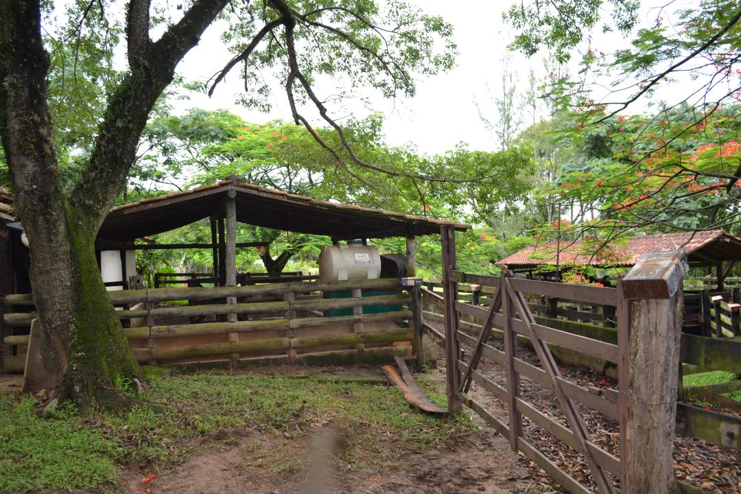 Curral para gado em madeira de lei, coberto, várias divisórias, brete e balança, além de uma área fechada para confinamento com cochos, divisórias, depósitos e máquina de triturar/moer.