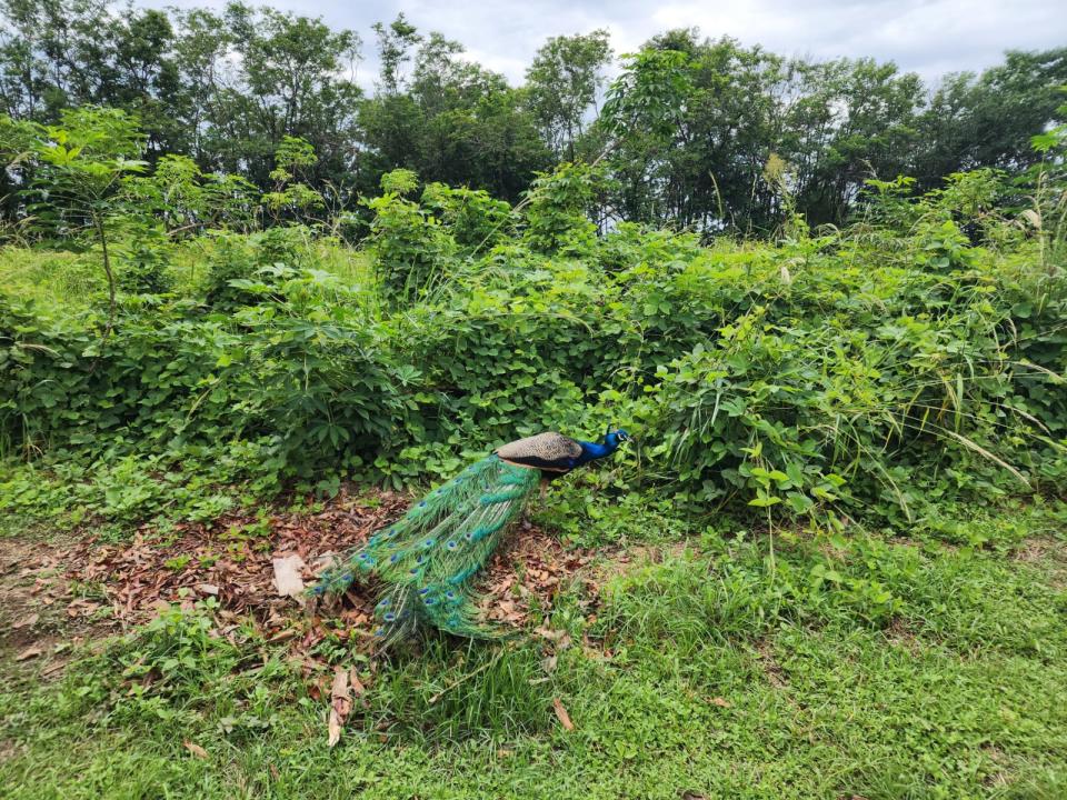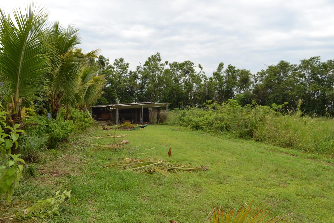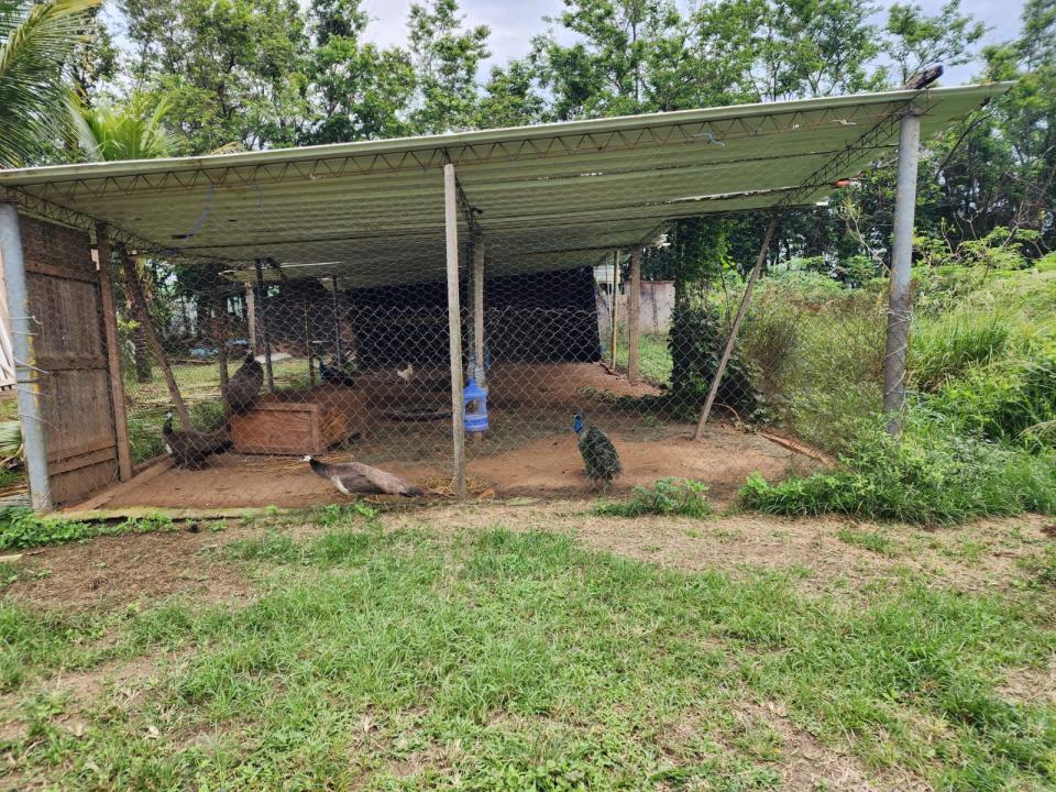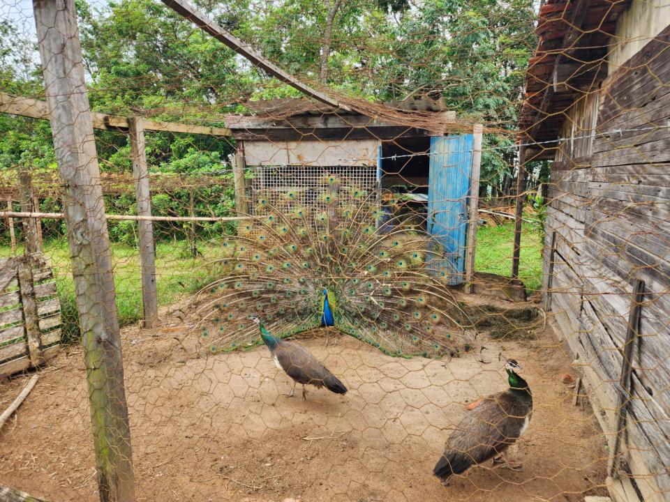 Horta cercada e coberta com sombrite, Galinheiros separados, para galinhas e pavões, área reservada para plantio de milho, feijão, mandioca etc.